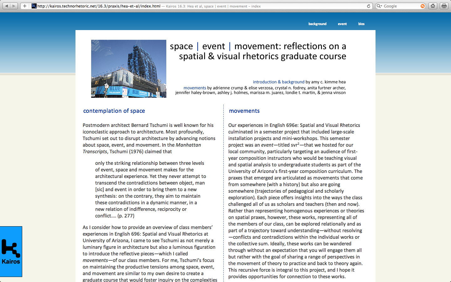 I was inspired by this collaborative movement (movement is the best word I have because text just doesn’t seem expansive enough). This movement represents a course called “English 696e: Spatial and Visual Rhetorics” at the University of Arizona. The collaboration of amy c. kimme tea, adrienne crump & elise verzosa, crystal n. fodrey, anita further archer, jennifer haley-brown, ashley j. holmes, marissa m. juarez, londie t. martin, and jenna vinson allows you to see the work of a classroom as a relational space of understanding, conflicts, and contradictions so that we can now EXPERIENCE a whole range of perspectives. I can’t imagine a better entry point into a classroom and its composing.