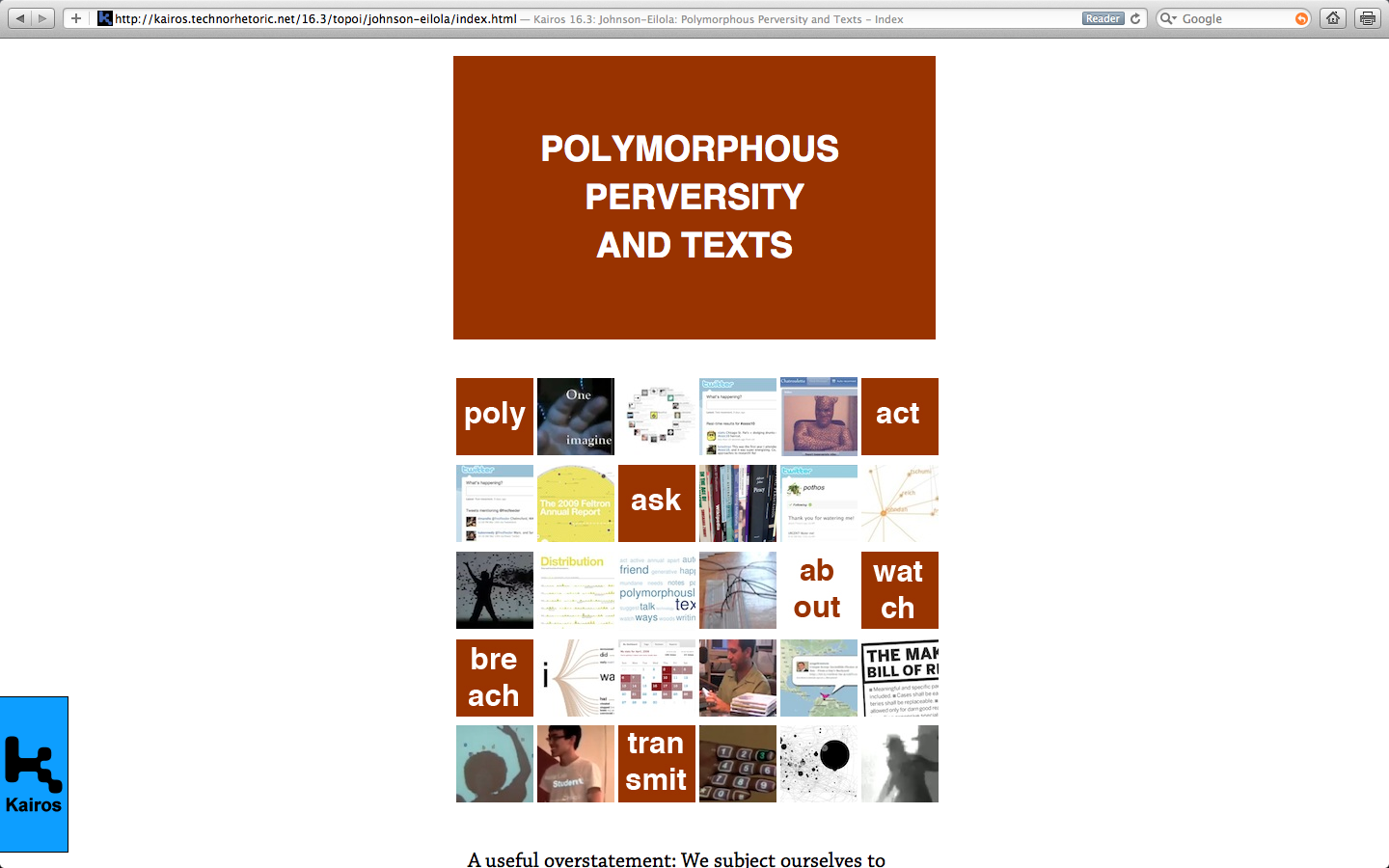 Johndan Johnson-Eilola’s “Polymorphous Perversity in Texts”, in the summer 2012 issue (16.3) of Kairos: A Journal of Rhetoric, Technology, and Pedagogy offers me a way of thinking about academic research and writing where the ideas just literally jump out at you. On top of that, Johnson-Eilola even offers an 89 MB zipped archive for readers/players/co-imaginers to go off and play some more.